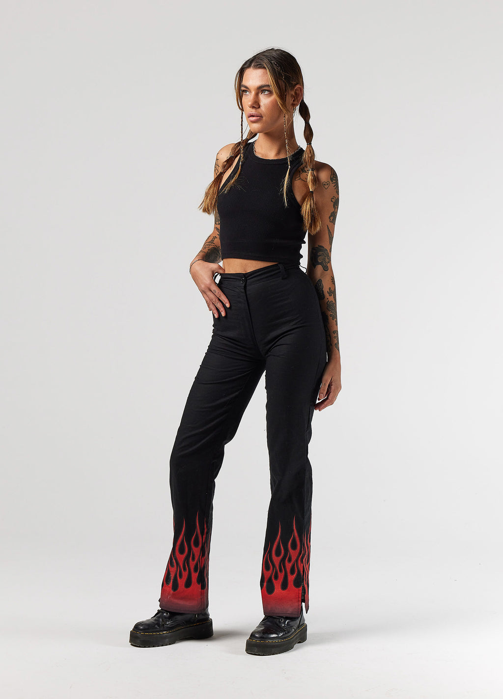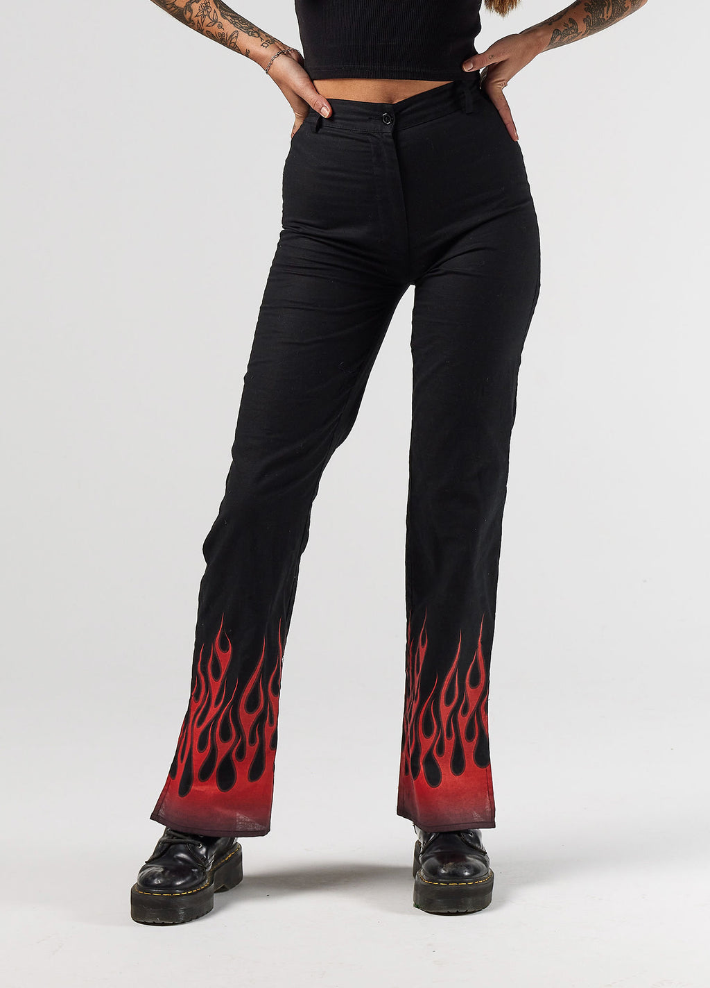 The Ember Pants scream rock n’ roll, with a chic edge. Constructed in a lightweight linen blend, featuring red flames creeping up the hem. They’re high-waisted and slim fit, with slits up the side seams. Pair her with one of our tee's for a casual, grunge vibe.