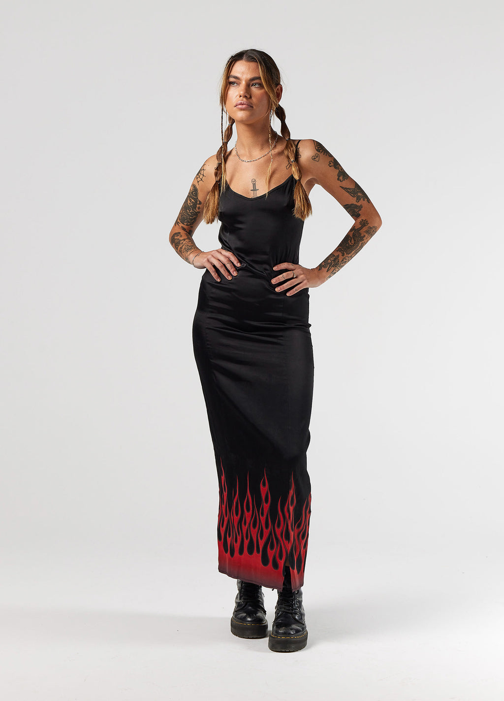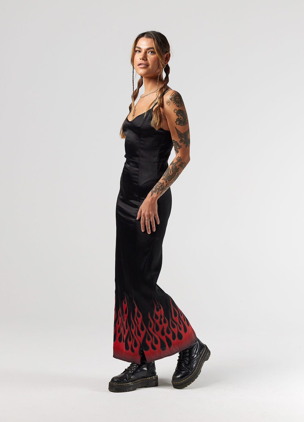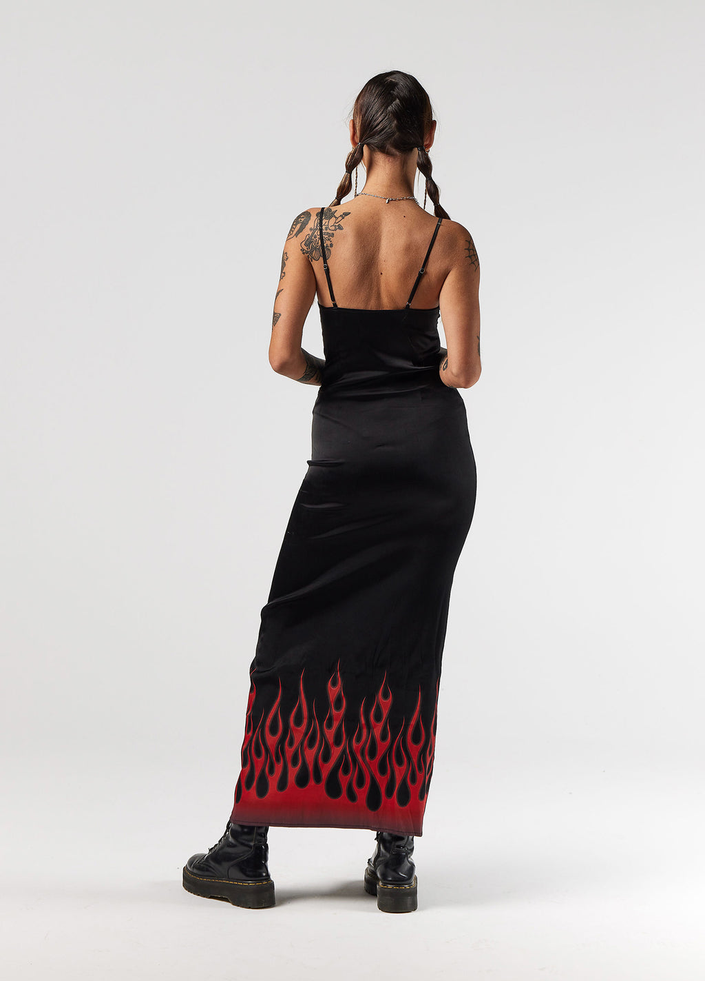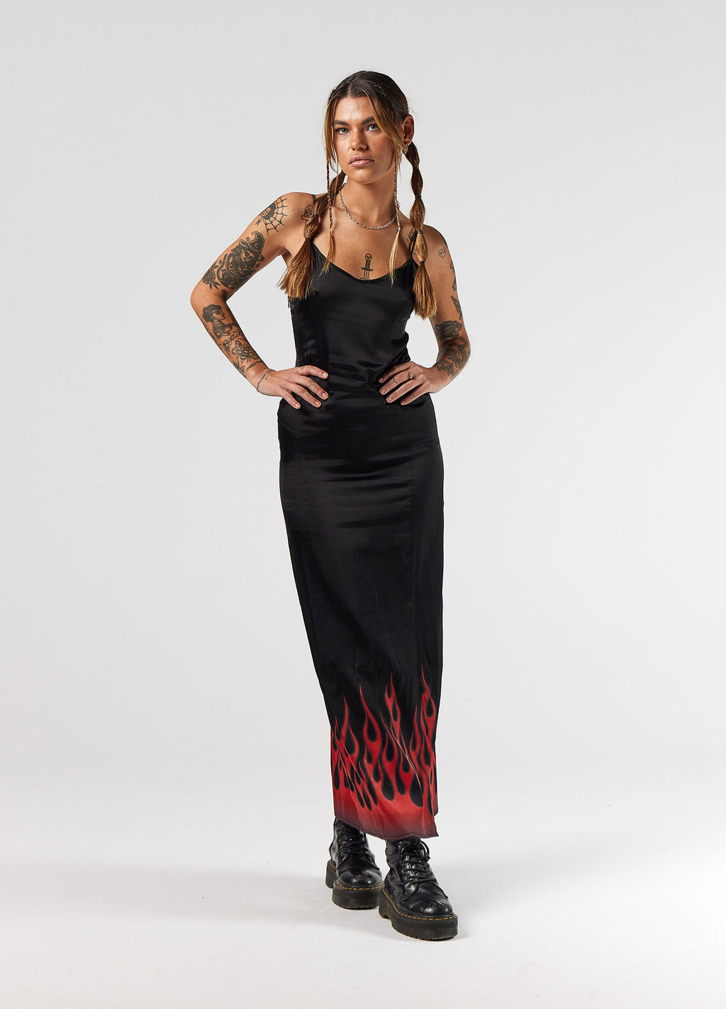 The perfect cocktail of feminine and edgy - The Jett Dress features buttery, silky (and sustainable) black fabric, with red flames creeping up the hem. She’s midi length, with a slight v-cut bust. With adjustable straps and darts in the bust and back, she’s made to drape perfectly over your body.