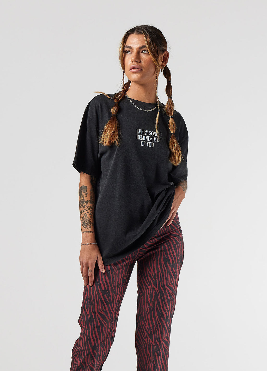 'EVERY SONG' Tee is our take on the classic, boxy-fit band tee. It features a soft, enzyme-washed cotton giving it that vintage, ‘worn’ feel - finished with our ‘Every Song Reminds Me Of You’ print. Pair with our Ember pants & blazer, or tied up with a pair of vintage shorts and cowboy boots.