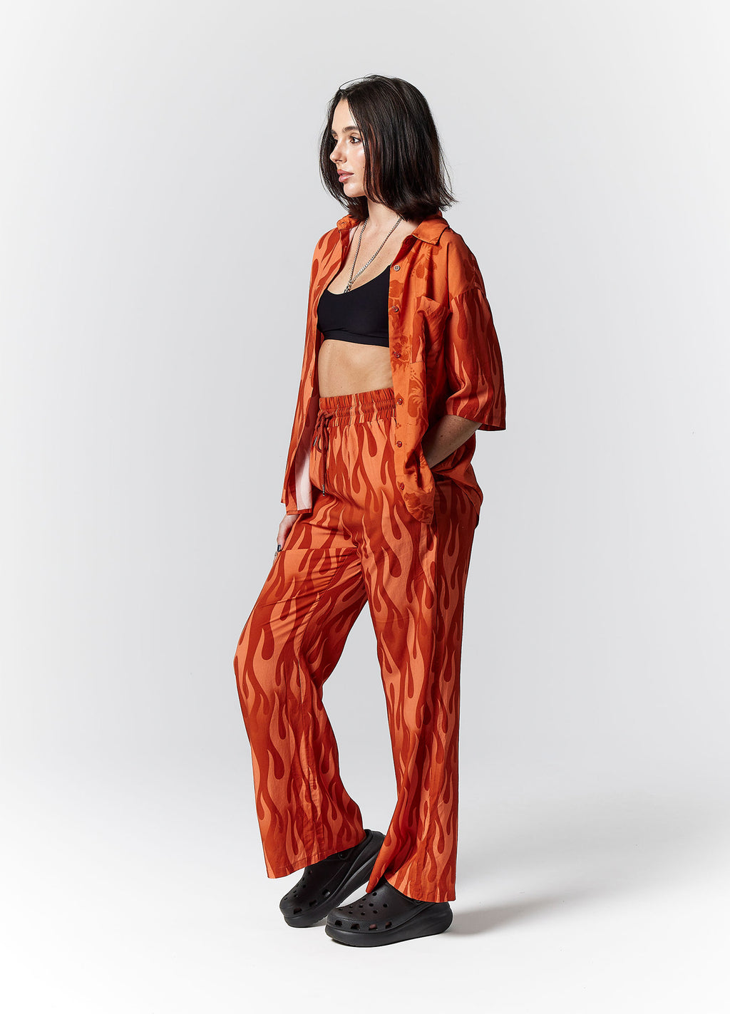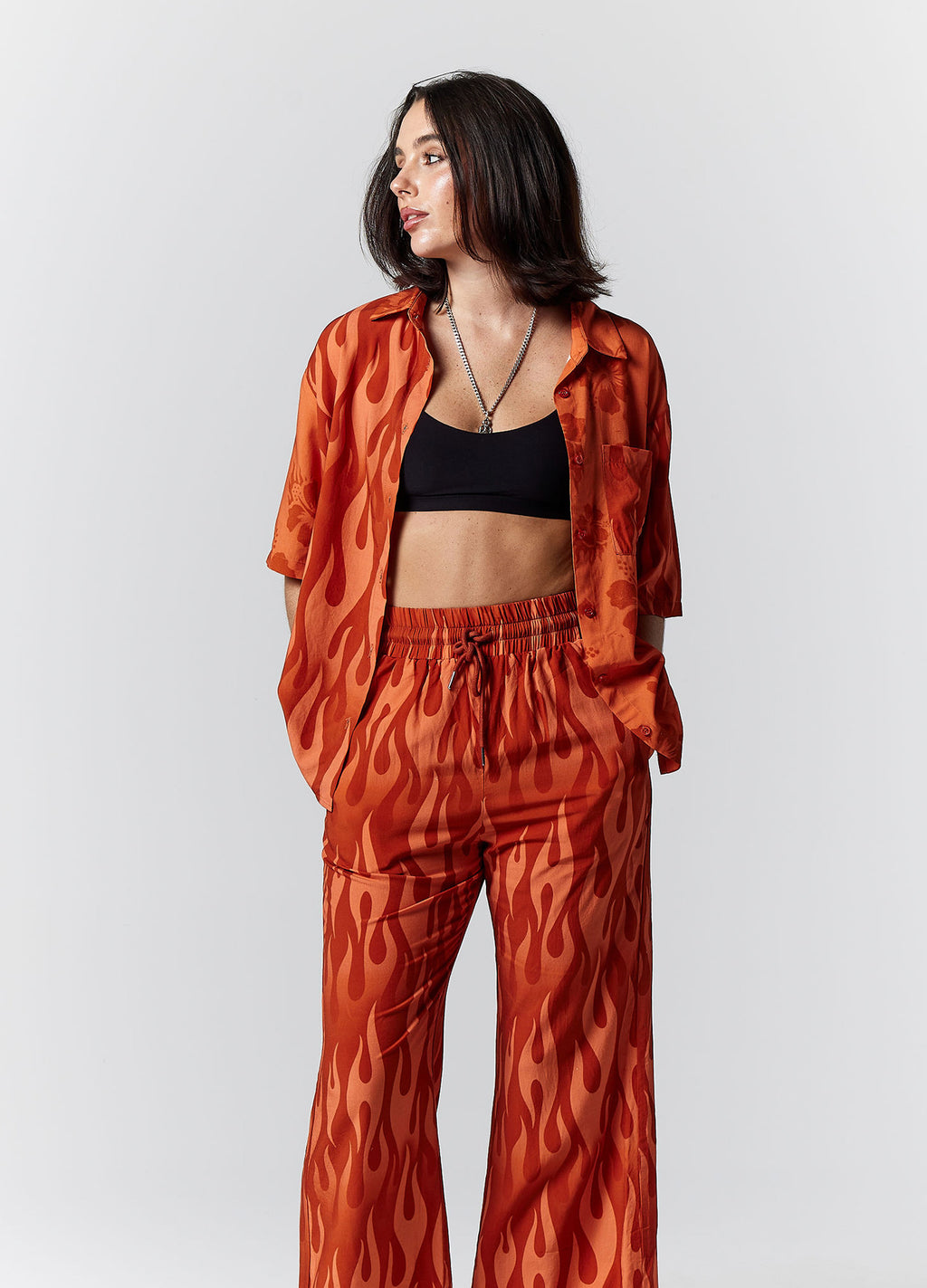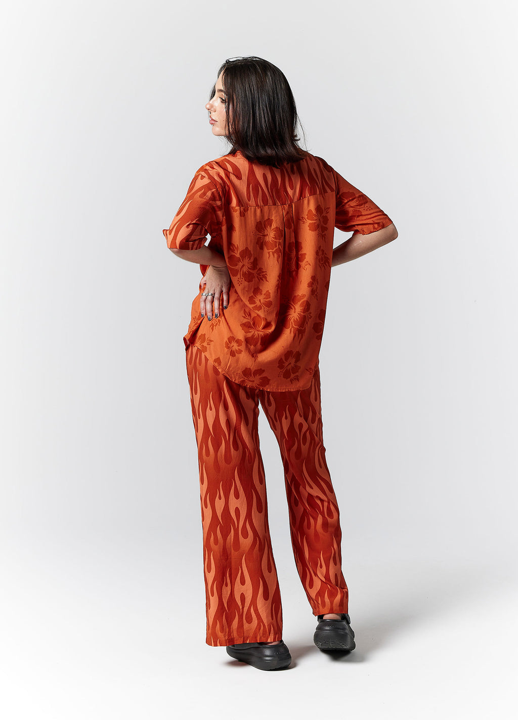 Eddie is our take on the classic, oversized bowling/party shirt. Featuring pattern blocking in our exclusive flame, and flaming hibiscus prints in burnt-orange hues. Pair with our Eddie Pants, or over swimwear.