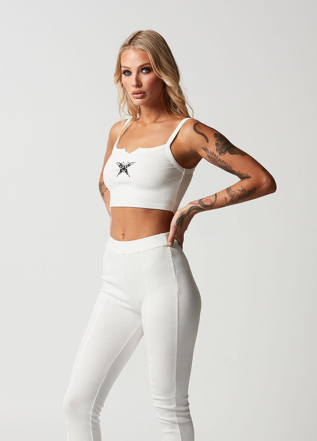 The Zephyr crop is straight from our favourite decade - featuring a 90’s butterfly tattoo embroidery, thick ribbed cotton binding around the straps and neckline, and a ‘V’ cut out at the bust. Pair it with the Pearl Ribbed Pants, or over some denim cut-off’s with black docs for the ultimate 90’s look.